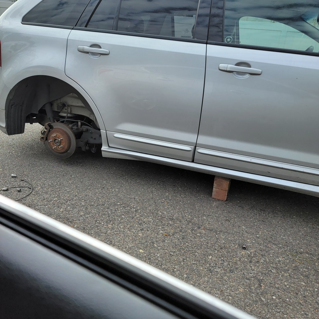 I was on my way to work and noticed this SUV on the side of the road. All four tires were stolen.